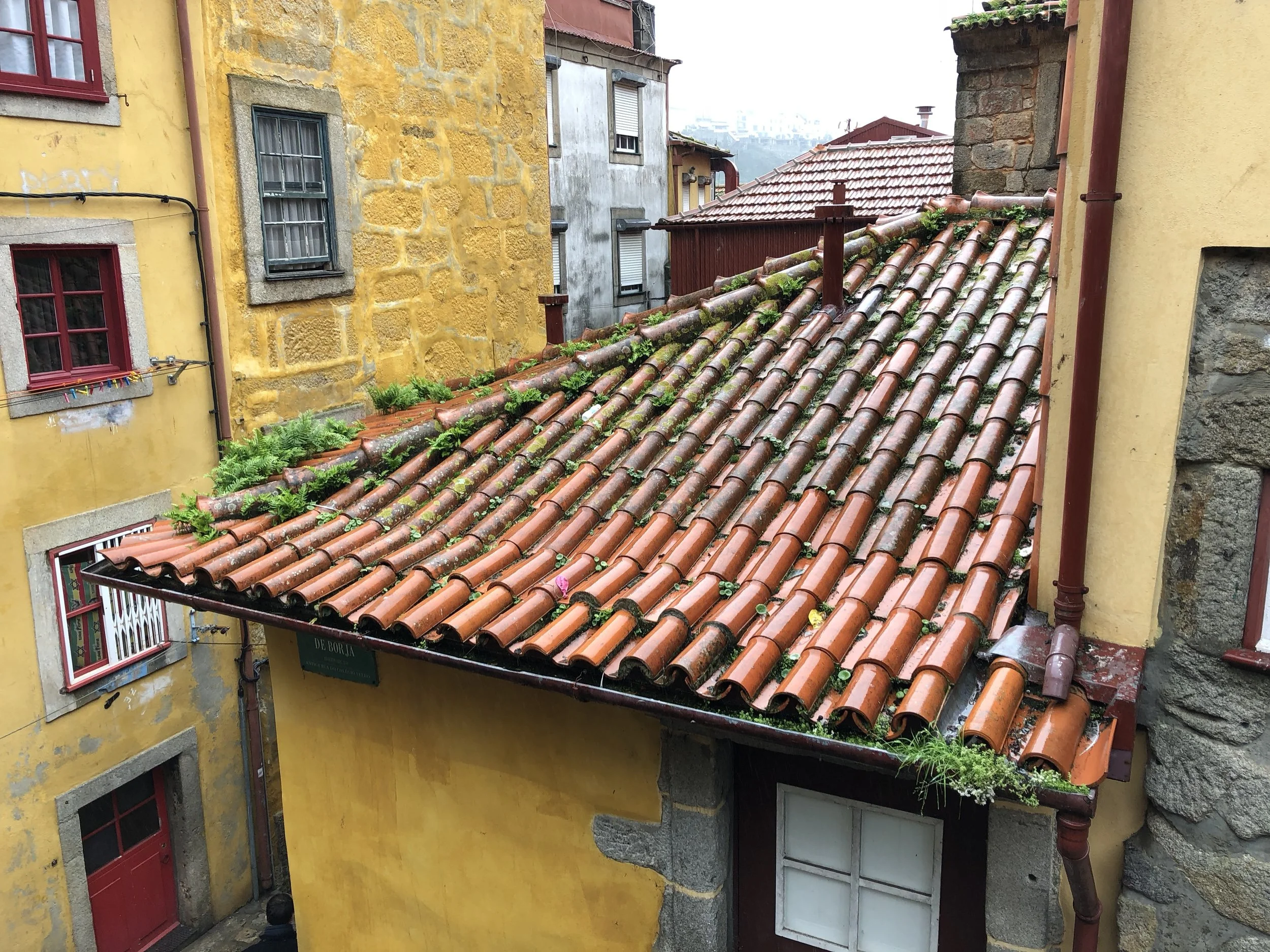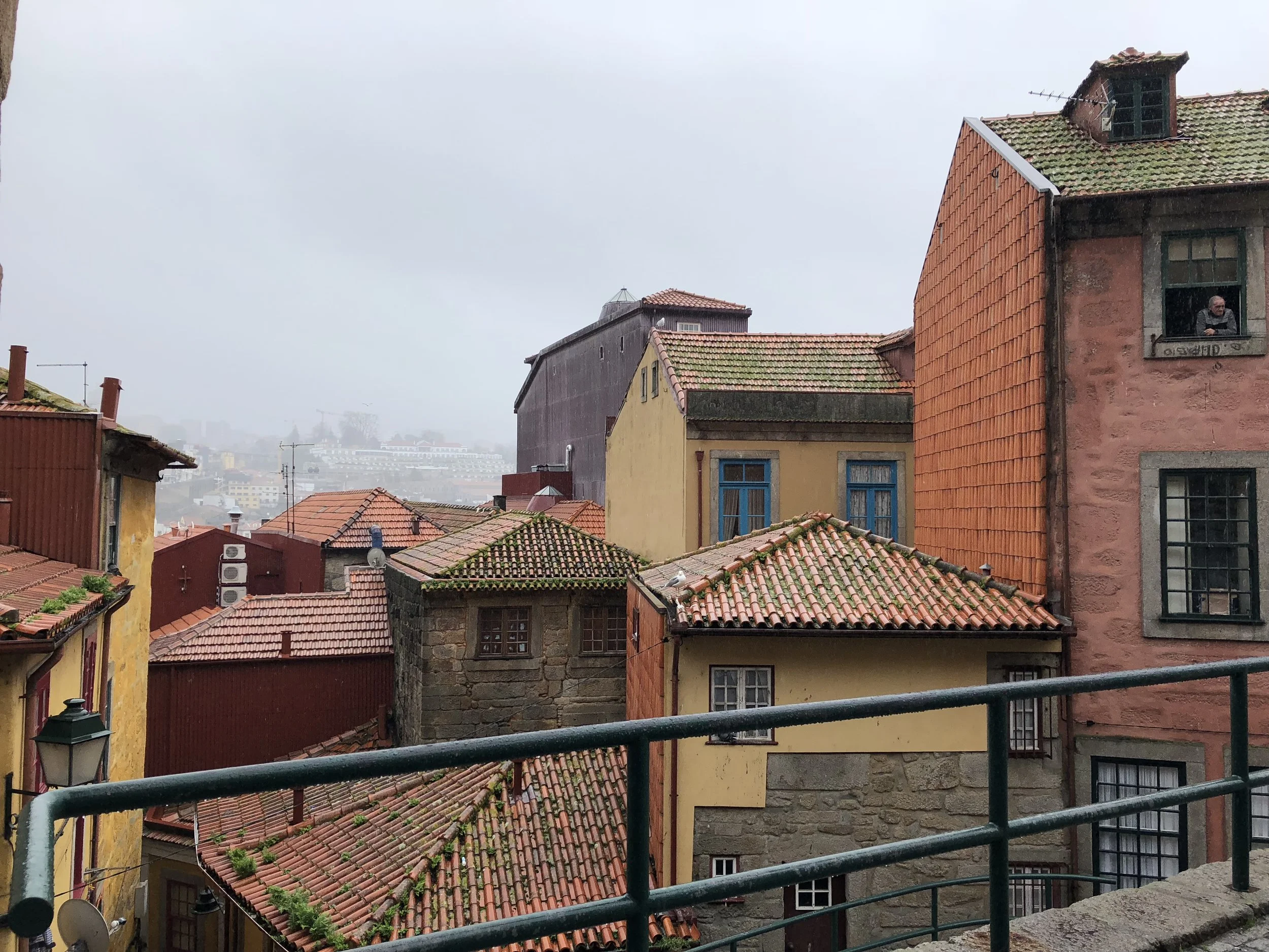 Colorful rooftop shot of Porto on a raining day. Note the local resident smoking out of his window in the top right.