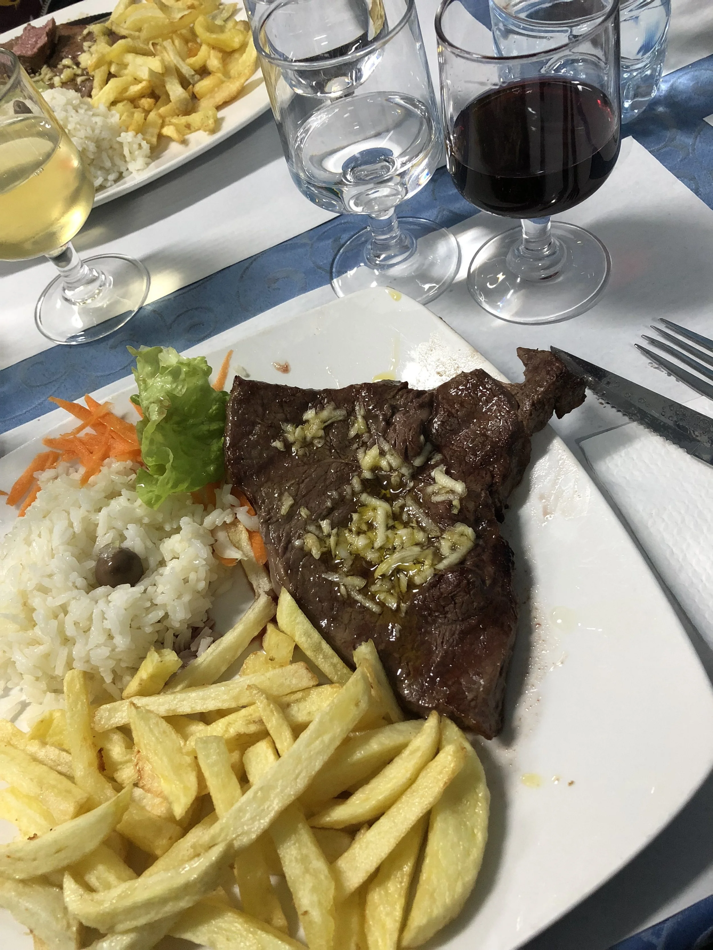 - Another insanely delicious Portuguese meal of steak, fries, rice, salad, and wine. More leftovers.