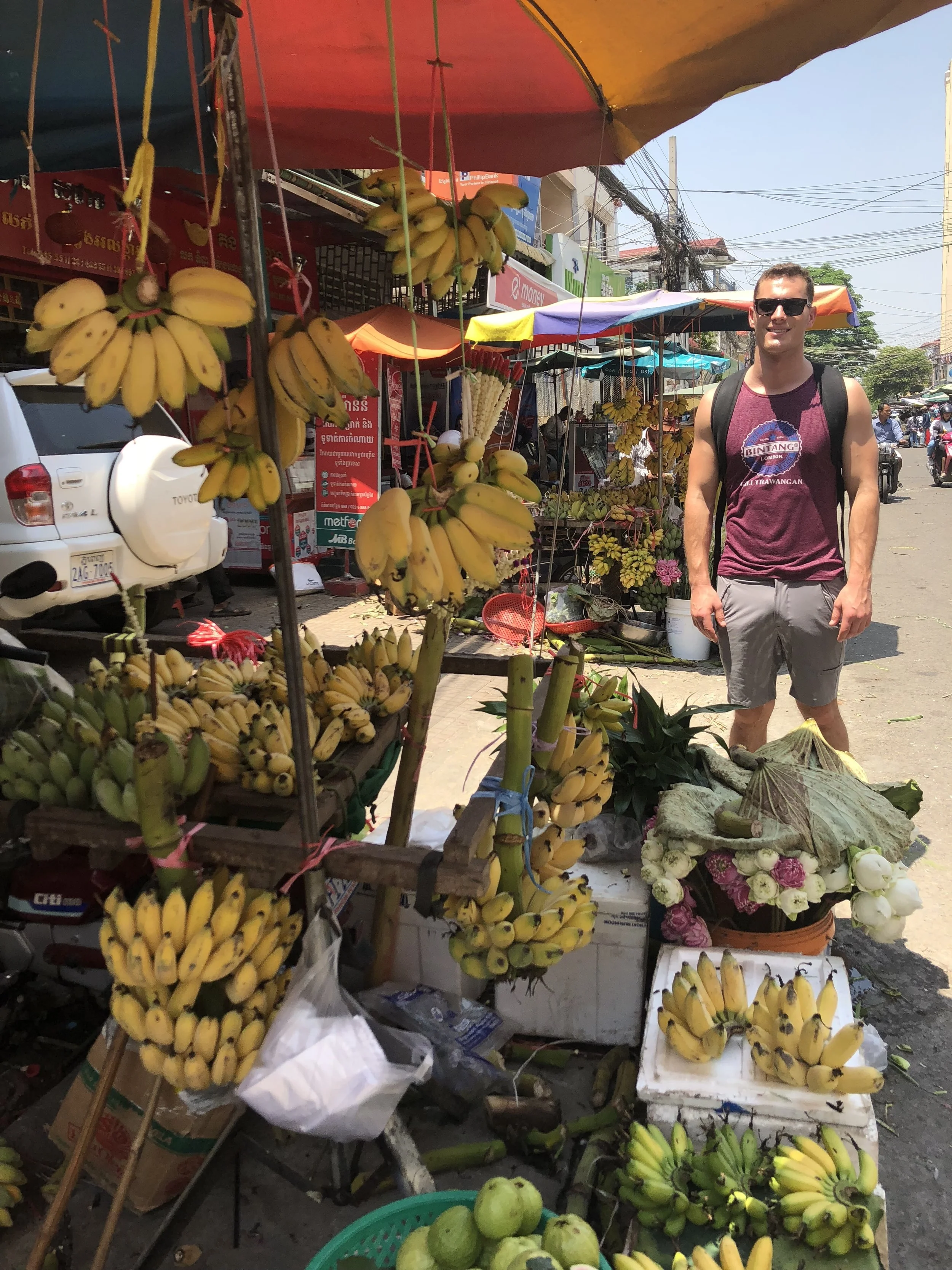One of the many fruit stands that line the streets of Phenom Penh. Also a very humid Kev :)