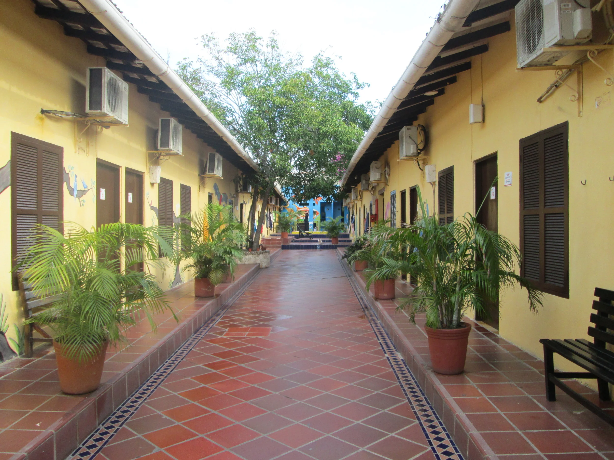 Inside El Viajero Hostel in Cartagena. Rooms line the corridor and culminate in communal bathrooms at the end.