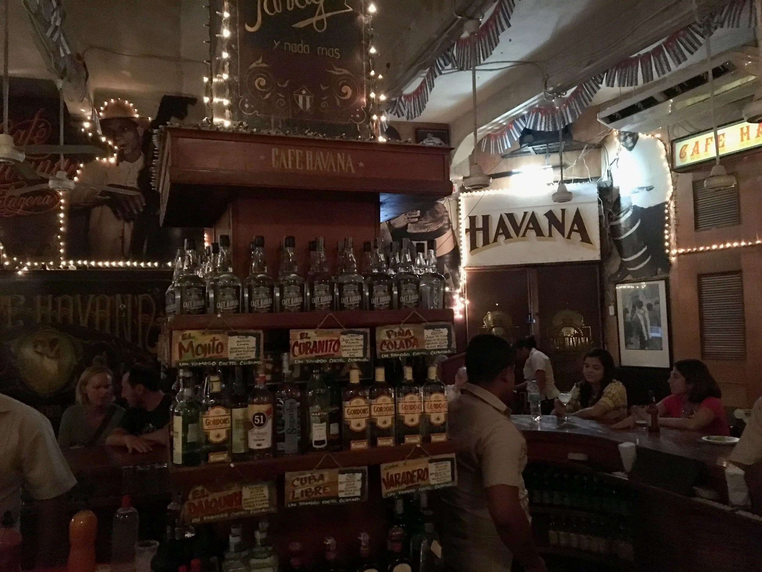 The very well-stocked bar at Cafe Havana (note the drink recipe cards!).