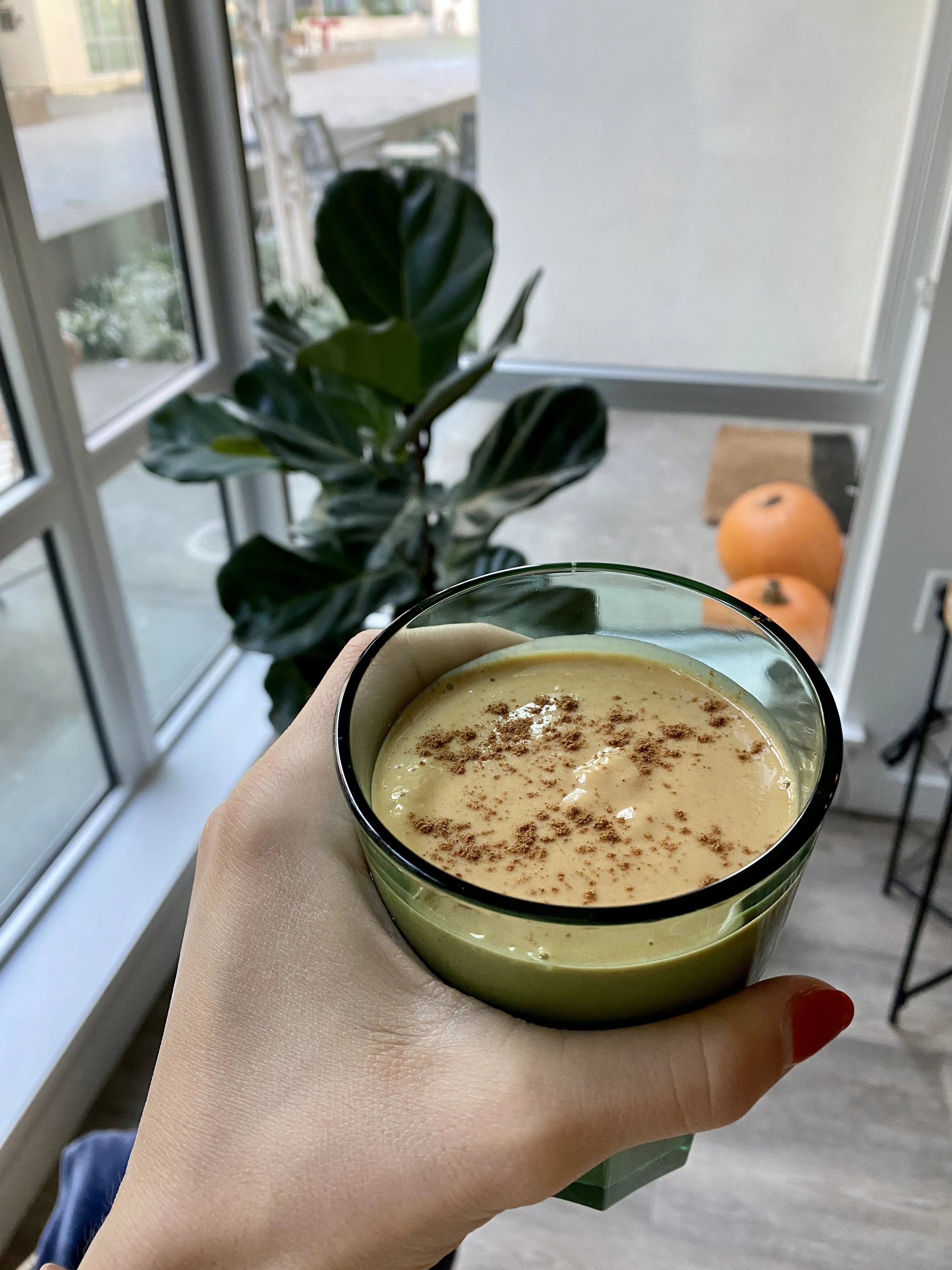 Sneaky veggies. With frozen rice cauliflower and a healthy dose of pumpkin puree, this smoothie makes me feel so good about my first meal of the day. Vegetables are full of fiber (which keeps you full) and critical micronutrients that contribute to all aspects of our bodily and mental health. One cup of raw cauliflower offers 77% of your daily vitamin C needs, which is an antioxidant that tamps down inflammation. One cup of pumpkin lends 200% of your daily vitamin A needs, which can help strengthen your body’s immune system.