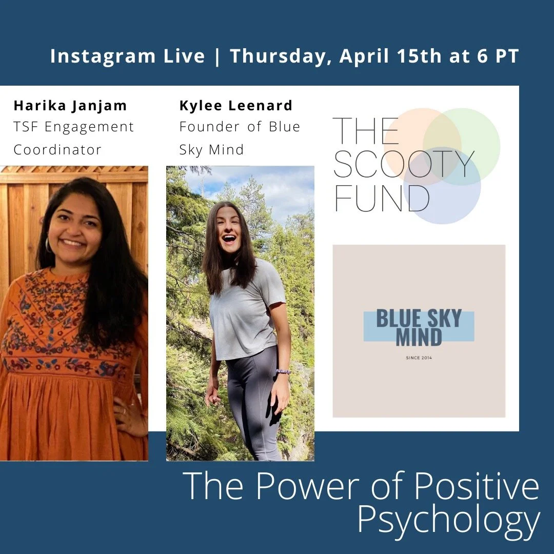 The best way to stay up to date on the conversation and connect with other members of the community beforehand is to click “Attend” on our event page, add the event to your calendar, then follow The Scooty Fund and Blue Sky Mind on Instagram to make sure you receive the notification when we’re live! We’d also love it if you’d introduce yourself in the event feed and share any questions you might have about positive psychology prior. xx