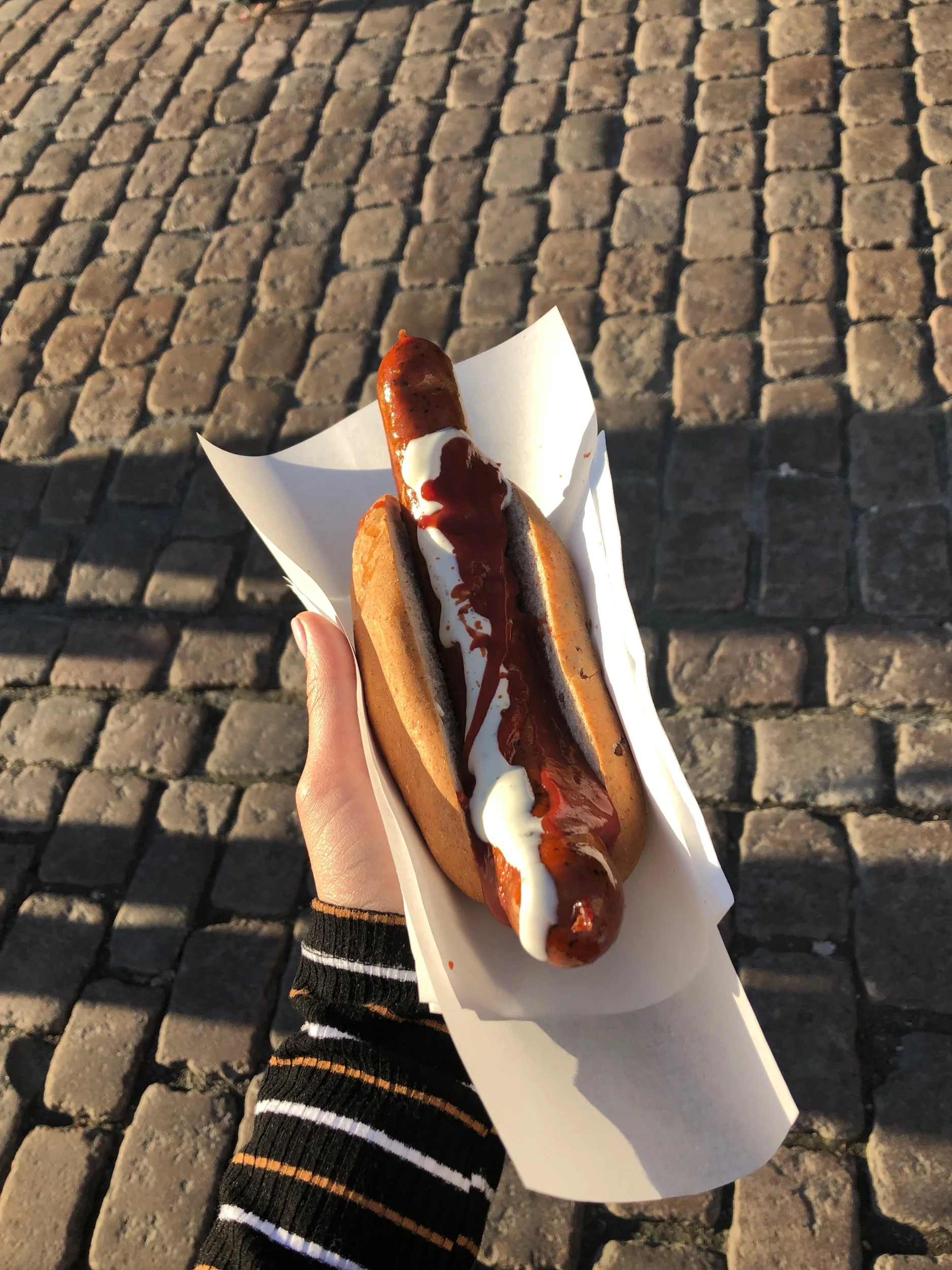 Chili garlic street dog from a famous cart in Bergen - Trekroneren. So good, so cheap (and cheap is a Norwegian rarity).