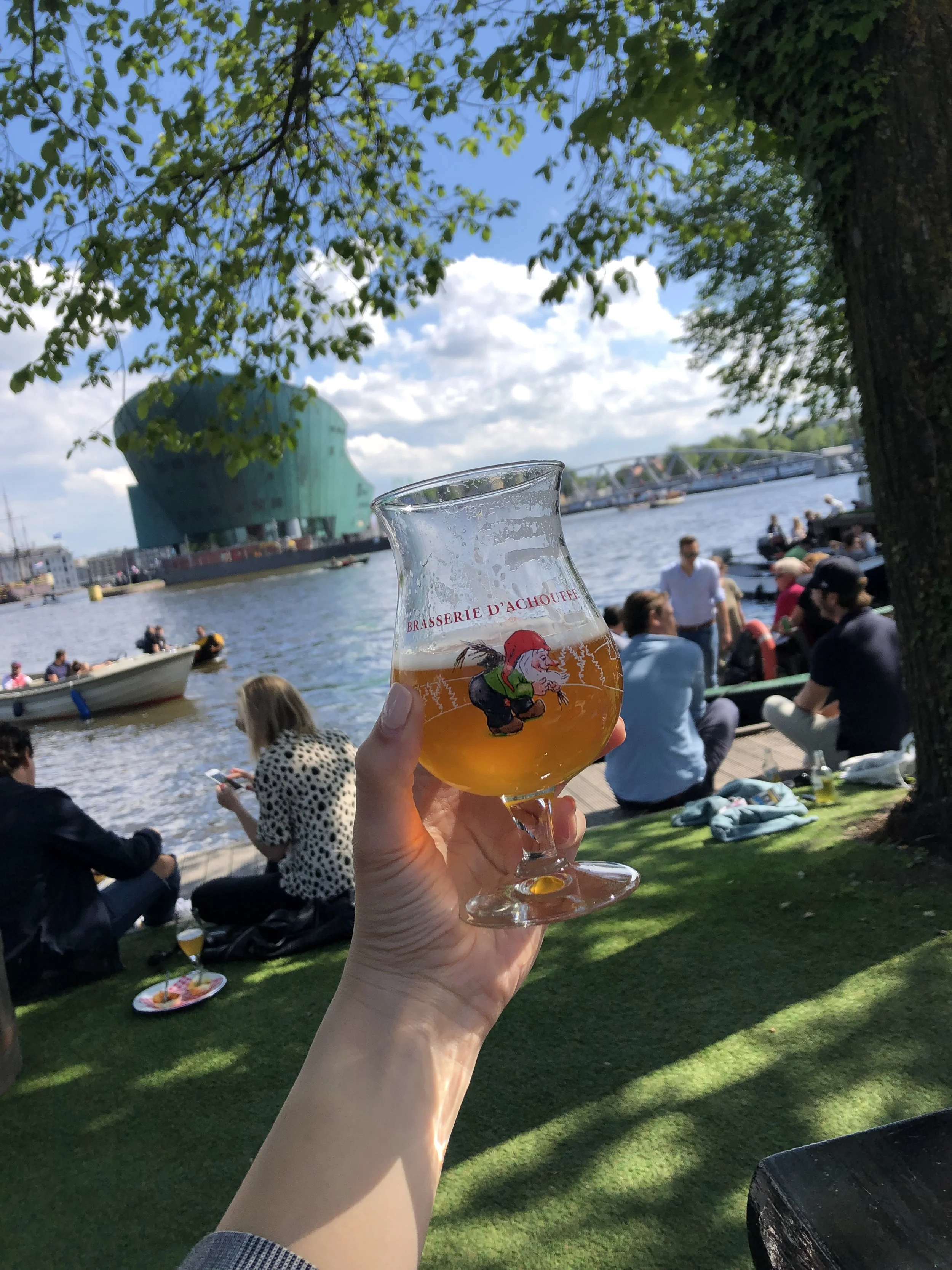 Back in Amsterdam at one of my favorite outdoor bars, Hannekes Boom! Drinking a delicious Belgian La Chouffe.