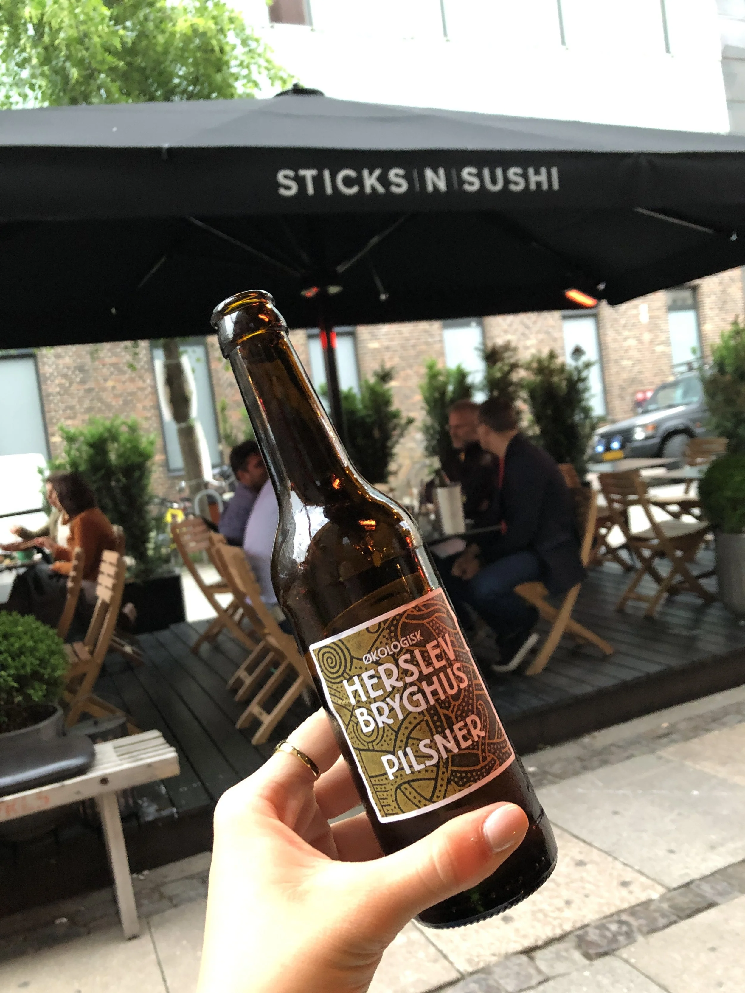 Enjoying a well-recommended Danish pilsner at Sticks N Sushi, an upscale sushi chain in Copenhagen.